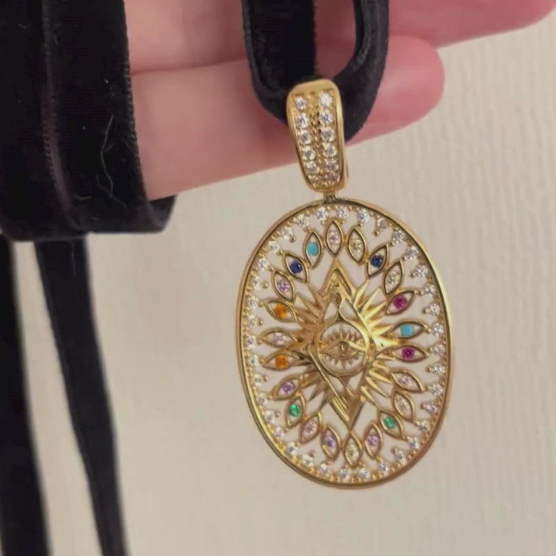 Choker muy especial en terciopelo negro y verde oliva con un medallón en circonitas multicolores para tu protección