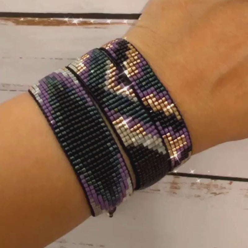 Mostacillas miyuki en tonos lila, morado y contrastes.